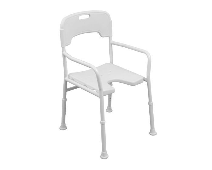 Duschstuhl mit Armlehnen und Rückenlehne sowie Hygieneausschnitt in der Sitzfläche zur Unterstützung bei der täglichen Körperpflege in und außerhalb der Dusche.