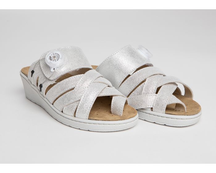 Diese offene Pantolette zur unterstützenden Hallux-valgus-Therapie ist in modischer Silberoptik gehalten.