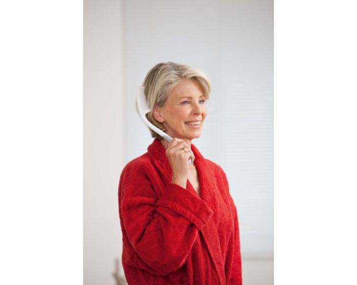 Bürstenkopf und Kamm sind der Kopfform nachemp­funden – so wird das Frisieren angenehmer. Die Griffe sind besonders lang und so geformt, dass der Hinterkopf besser erreicht werden kann. Schultern und Armgelenke werden deutlich weniger belastet als mit herkömmlichen Bürsten und Kämmen. Die Griffe sind aus einem rutschhemmenden Material, das sich auch bei nassen Händen gut greifen lässt.