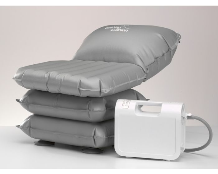 Der »Luft-Fahrstuhl« von Winncare Mangar erleichtert den Badewannen-Ein- und -Ausstieg. Das Kissen wird mit dem Kompressor für den Einstieg aufgeblasen. Der Nutzer nimmt Platz, lässt die Luft aus dem Kissen entweichen und sich bis auf den Wannenboden absinken. So kann ein Vollbad genommen werden. Die Rückenlehne kann mit mehr oder weniger Luft gefüllt bleiben. Nach dem Bad wird das Kissen wieder aufgepumpt, sodass der Ausstieg leicht fällt.