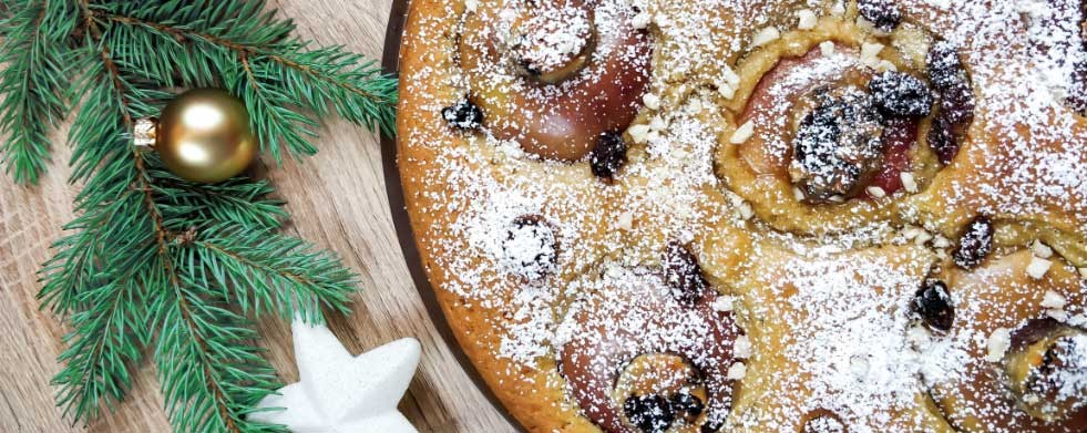 Wir freuen uns auf die schönste Zeit des Jahres: Die Adventszeit. Fenster und Straßen, liebevoll dekoriert, erstrahlen in hellen Lichtern. Aus der Küche duftet es nach Leckereien und Weihnachtspunsch und beim Adventskaffee wird es gemütlich mit Kaffee und Kuchen. Unser Rezept-Tipp für einen schönen Nachmittag: Ein weihnachtlicher Bratapfelkuchen. Der Kuchen mit ganzen Äpfeln, die im Inneren mit Marzipan, Rosinen und Mandeln gefüllt sind, ist schnell zubereitet.